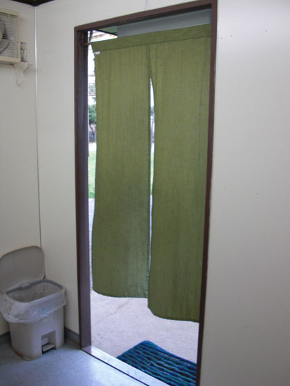 一般トイレの入り口には足拭き用のマットが置かれ、目隠し用の暖簾がかかっています。