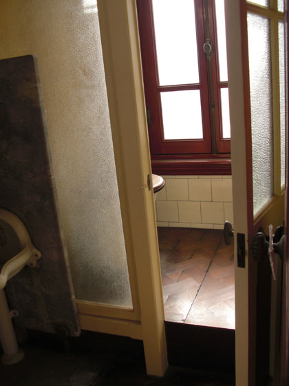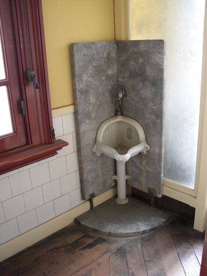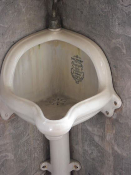 洗面器と小便器の陶器には、英国の陶器メーカー「ドルトン(現:ロイヤル・ドルトン)」社と同社工場のロゴが、今も消えずに残ってるところを確認することができます・・・・・・良いことです。