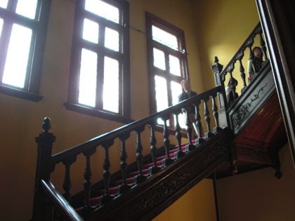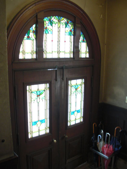 住人用の玄関は洋館脇にその入り口があり、ステンドグラスがはまってたりしてちょっと洒落てますね。