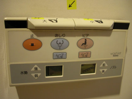 多目的トイレの洗浄は壁のボタンに床のボタン。