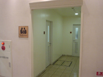 このビル地下1階は、西友の顧客を含めたビル利用者のための駐輪場があるのですが、ビル南から駐輪場へと階段を降り、無味乾燥で味気の無い駐輪場を北へ抜けた先に非常階段やエレベーター、今回見聞いたしましたトイレがあるわけですが、そのトイレ前はこんな感じ。