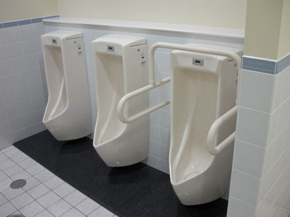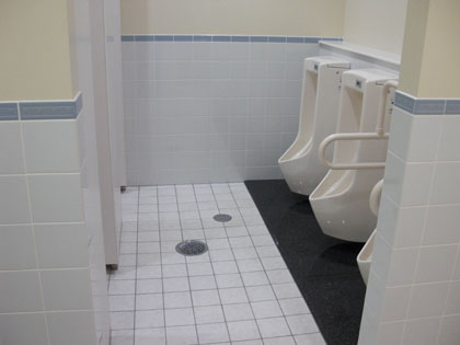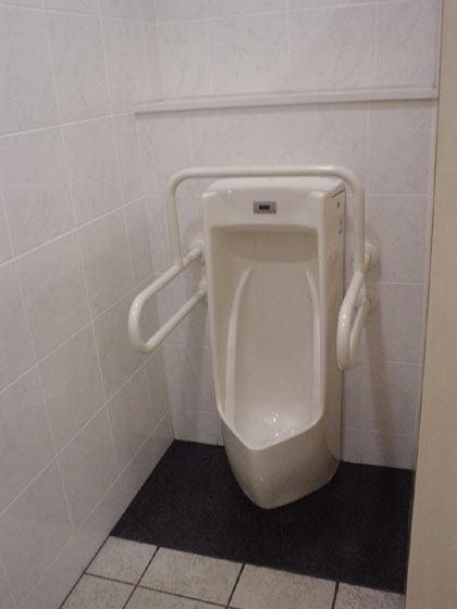 この地下1階トイレには多目的トイレはなく、その編成は手すり付きの小用トイレが1つに、