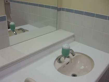 すっきりとした洗面台は広々として、液体石鹸とエアータオルが設置されています。