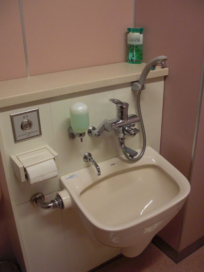 洗面台は無く、代わりに洋式便器の横の壁に小さな手洗いが設置されています。